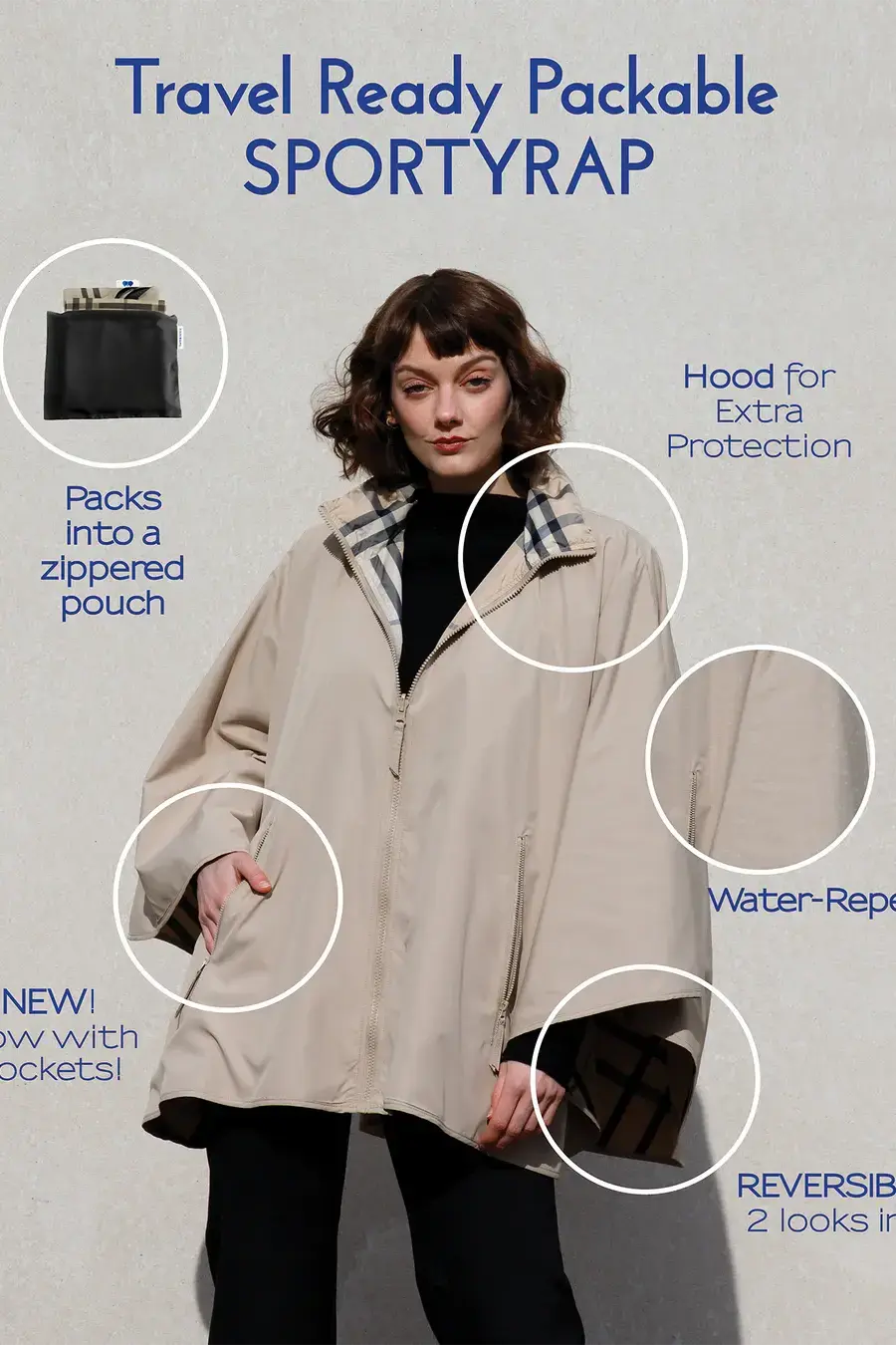 The SPORTYRAP is a fashionable alternative to traditional rainwear designed for the active woman: reversible, with a front zipper (on both sides), one set of zippered pockets (one side) and a hidden hood. The SPORTYRAP is water-repellent, lightweight, fast-drying and easy to store in its matching travel pouch.