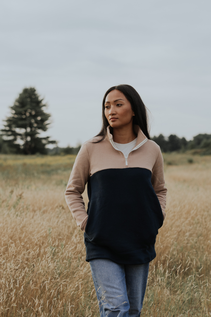 Women's Classic Mountain Sweater Fleece in Stucco and Navy by Blondie Apparel🇨🇦 Final Clearance