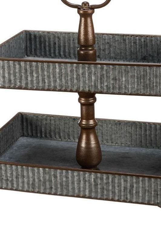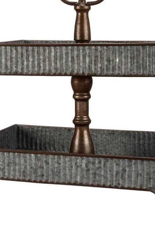 A decorative two tiered tray featuring galvanized rectangular metal tiers with rib accents and handle. Our Two Tier Rib Rectangle tray is perfect for displaying small items in store or at home. Assembly required.