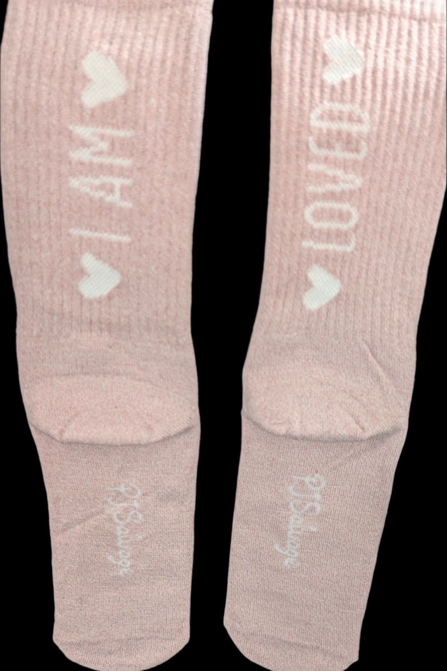 Pink rib crew sock with a white message that "I am (heart)".